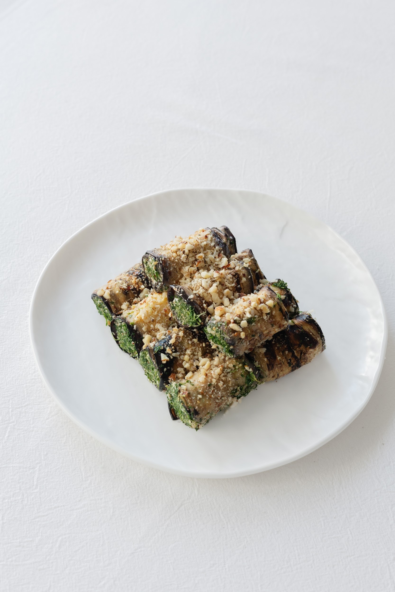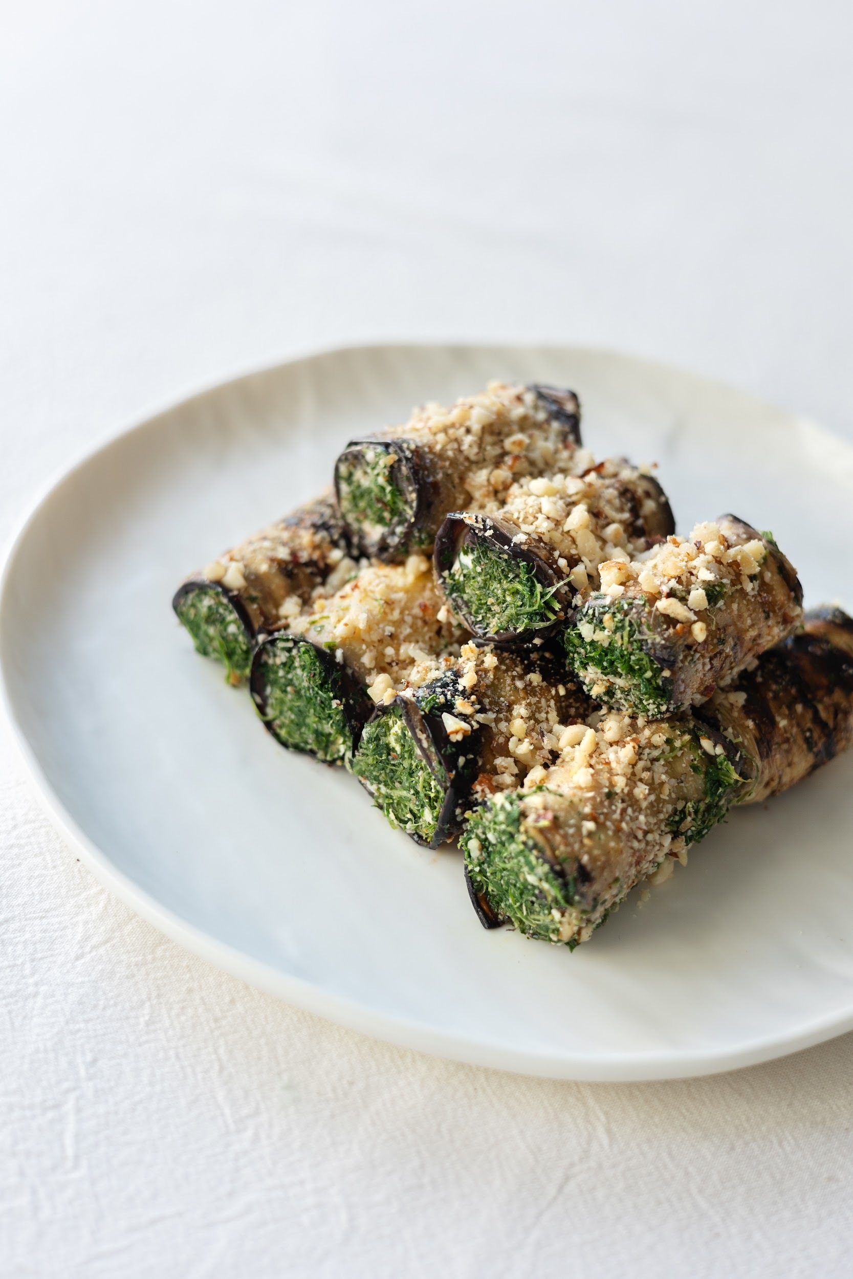 Рулетики из баклажанов с творожным сыром, кедровыми орешками и зеленью